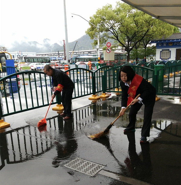 由于連日的陰雨,高鐵站發車區域地勢比周邊地勢低洼,有的地方積水嚴重,旅客上車非常的不方便。 為給旅客提供干凈整潔的環境,高鐵站工作人員利用發車空閑時間,及時清掃發車區域的積水,讓旅客來得開心,走得順心,身體力行實踐流動之家“將需要給我,把滿意給您”的服務宗旨。