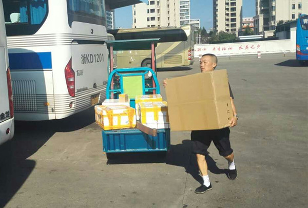 8月8日下午兩點,今天的天氣預報最高溫度是36℃,可是室外溫度依然高的可怕。東站行李房外,一輛永康班車迎面駛來,54歲的裝卸工胡瑞華立刻推著手推車迎了上去。車停穩后,車上旅客紛紛下車跑向陰涼處,。對大部分人來說,這種太陽下面站著都吃不消更別說干活了。可是,胡瑞華在太陽底下一件又一件地卸貨,認真干好本職工作沒有一絲怨言。今天貨有點多,卸了滿滿一車,好在胡瑞華技術嫻熟,不一會兒就卸完了,推著車走進行李房。雖說只有幾分鐘的功夫,但胡瑞華已是滿頭大汗。車推進行李房后,他對著電扇吹了幾下又接著開始安檢理貨入庫的工作了。
