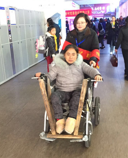 3月1日12點左右,正值出行高峰,售票廳里人頭攢動,買票的長隊緩緩挪動著。一位中年女性乘客,身穿灰色棉衣,頭頂的頭發有些斑白,被人群擠到了一旁。她雙手搭在輪椅的扶手上,費力地往售票窗口前行。