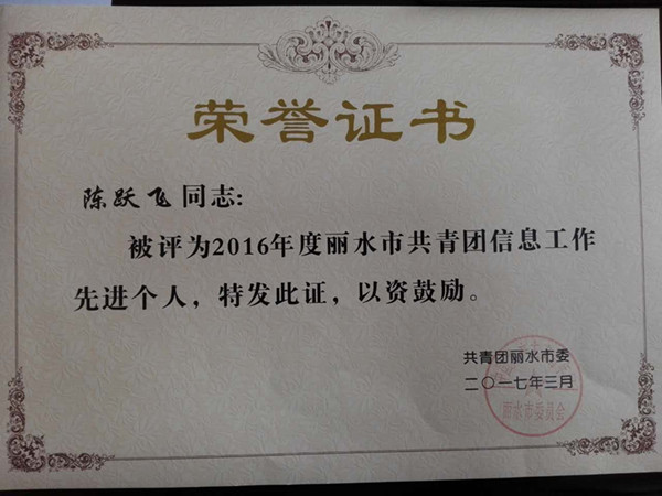 3月9日,共青團(tuán)麗水市第四屆委員會第二次全體會議在市行政中心108會議室順利召開。會上,集團(tuán)公司團(tuán)委被授予“麗水市共青團(tuán)工作目標(biāo)考核優(yōu)秀單位”,同時鑒于陳躍飛同志在共青團(tuán)信息工作方面的突出表現(xiàn),被團(tuán)市委評為“2016年度麗水市共青團(tuán)信息工作先進(jìn)個人”。