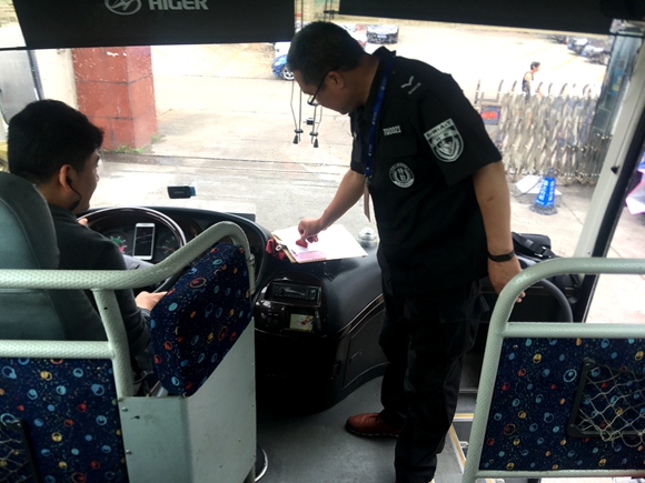 車輛出口門檢崗位上,保衛(wèi)稽查科員認(rèn)真核對人數(shù)、提醒乘客系好安全帶,把好“五不出站”關(guān)口。