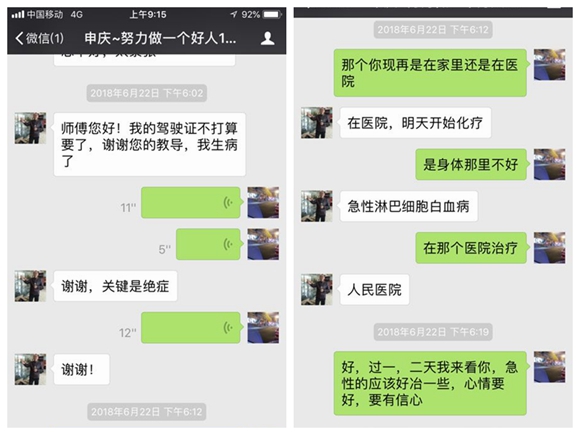 經核實,這條消息是浙K0058教練車學員梅申慶發出的求助消息,該車教練員周偉在6月22日也收到了學員梅申慶的微信留言,表示不能繼續學車了,周偉就很納悶,問他好好為什么不學了。梅申慶回答說自己生病了,而且得的是絕癥--突發性白血病!周偉教練當時感到很震驚,想不到前幾天來學車時還好好的一個學員,怎么突然間就得了重病。他知道白血病治療需要巨額費用,梅申慶家經濟條件又不是很好,當即發了188塊微信紅包鼓勵梅申慶樹立信心、積極接受治療。