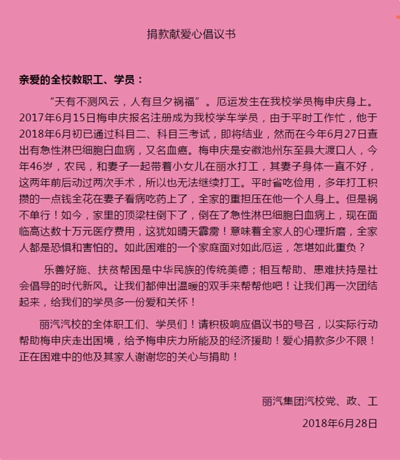 6月27日,麗汽集團汽車技術學校的微信公眾號收到一條來自學員的消息:“我是麗汽汽校的一名學員,突患急性淋巴細胞白血病,希望汽校領導能幫我籌點款,謝謝!”