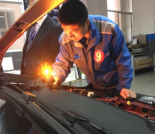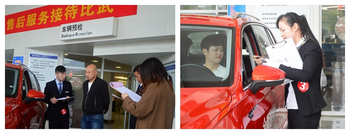 在下午進行的售后接待比武項目中,主要設置了禮迎客戶、環車檢查、唱檢車檢項目、車輛問診、簽訂委托書等環節,考察選手對維修接待崗位工作技能的熟悉程度和解決實際問題的能力。選取服務接待的典型工作任務--常規保養接待,要求選手按照真實工作情境接待顧客并做好服務。