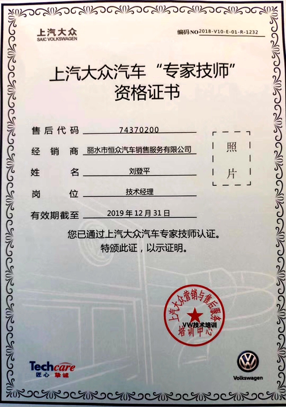 近日,麗水恒眾公司技術經理劉登平被評為上汽大眾“專家技師”。這是上汽大眾品牌進駐麗水市區以來員工首次獲得該項榮譽。劉登平是上汽大眾在麗水市目前唯一一個獲此榮譽的專家技師。