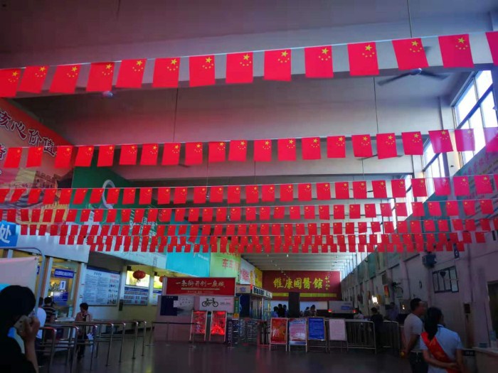 今年是中華人民共和國成立70周年,為團結動員廣大黨員干部和員工以極大熱情投身到車站的工作中,客運東站在候車廳、站場以懸掛國旗為主導,配合彩旗和燈籠、鮮花,營造莊嚴肅穆的國慶氛圍,讓出行的旅客感受到濃厚的節日氣氛。