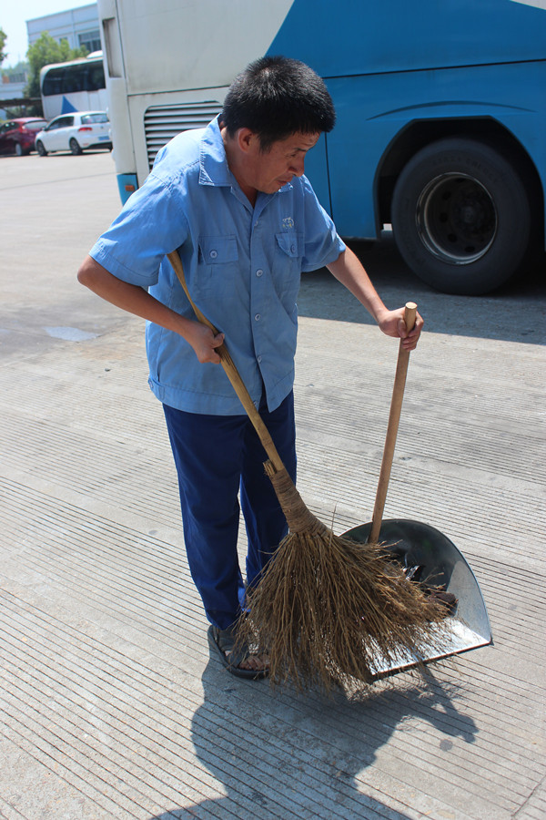 中午11:00時,保潔員宓建文一手拿著簸箕,一手拿著掃帚,冒著高溫酷暑,重復著低頭、彎腰的動作,堅持清掃站場垃圾。由于室外天氣酷熱,汗水順著他的額頭和臉頰留下。