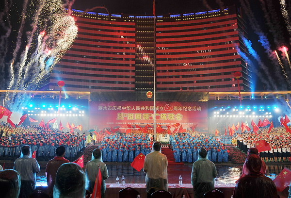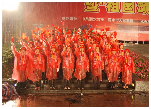 麗水市慶祝新中國成立60周年紀念活動暨“祖國頌”廣場歌會隆重舉行。歌會分革命英雄贊、建設新中國、走進新時代三個篇章進行。15個方陣依次進行大合唱,每個方陣各唱一首歌。