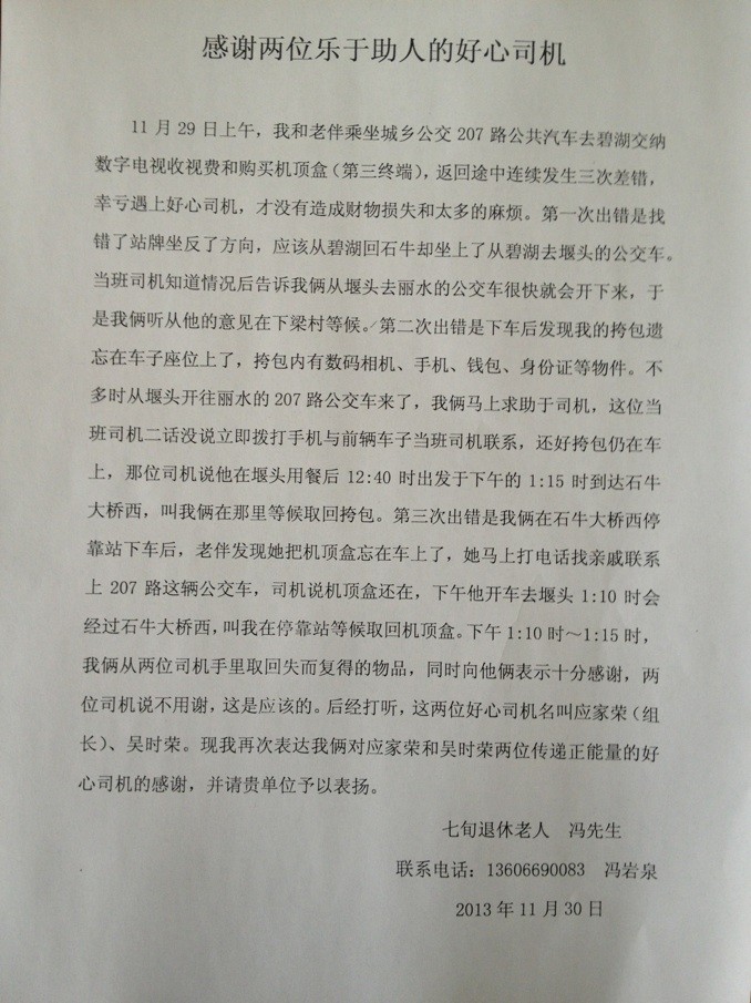 經了解,11月29日上午,市民馮先生和他老伴乘坐207路公交車去碧湖繳納數字電視收視費和購買機頂盒,在往返途中連續發生三次差錯,幸好遇上好心司機,才沒有造成財物損失和太多的麻煩。第一次出錯是找錯了站牌坐反方向。兩位老人繳費和購買機頂盒后,應該從碧湖回石牛,但卻坐上了碧湖去堰頭的公交車。當班司機知道情況后,及時將車停靠,并詳細告訴老人從堰頭去麗水的公交車很快就會開來,告訴他們應該哪里下車,于是兩位老人在下梁村等候。第二次出錯是下車后,馮巖泉發現下車地點對了,但挎包遺忘在車子座位上了,挎包內有數碼照相機、手機、錢包、身份證等物件。沒多久從堰頭開往麗水的K207路公交車來了,馮巖泉馬上向司機求助,這位當班司機立即撥手機與前輛當班司機聯系,還好挎包仍在車上,司機說他在堰頭用餐后12點40分出發,于下午的1點15分到達石牛大橋西,叫老人在那里等候取回挎包。第三次出錯是在石牛大橋西停靠站下車后,馮巖泉老伴發現她把機頂盒忘在車上了。老人通過親戚打電話聯系上了他們剛才乘坐的公交車,司機說機頂盒還在,下午他開車去堰頭1點10分會經過石牛大橋西,叫老人在停靠站等候取回。下午1點10分-15分,馮巖泉分別從兩位司機手里取回了失而復得的挎包和機頂盒,同時向他倆表示十分感謝,并再三詢問駕駛員姓名,想通過媒體進行表揚一下。而這兩位司機都笑笑說:“這是件非常普通的事,誰遇到這種事都會這么做的”。