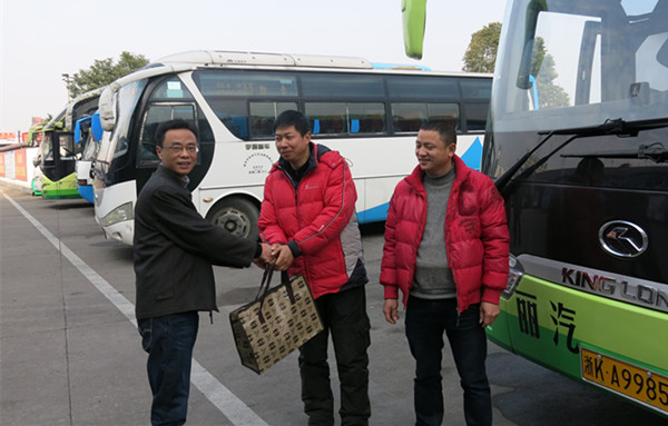 1月17日上午,旅游集散中心經理葉劍飛、工會主席葉學敏、副經理余雷及車隊隊長王華南一行在汽車東站經理梁巍的陪同下,給在東站春運加班的駕駛員送去節前的問候和慰問品,叮囑駕駛員路途首先是注意安全,在駕車時必須控制好車速,特別是在駛經彎道、坡路、橋梁、窄路和視線不良、交通流量大的路段或遇到下雨、下雪、大霧等惡劣天氣時,更要按照限速規定嚴格控制車速,避免發生交通事故;然后做好保暖工作,搭班駕駛員互相照應,不能疲勞駕駛,注意自身健康。