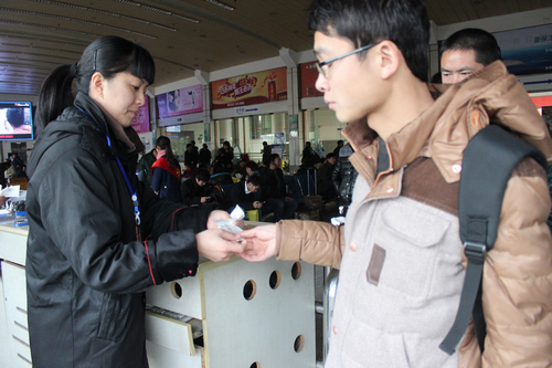 早已歸心似箭的旅客拎著大包小裹立刻在1號檢票口排起了長龍,趙妍不慌不忙的雙手接過旅客的車票看一眼票,然后刷票、撕下票根,一個、兩個、三個……一會兒的功夫,趙妍便完成了對幾十個旅客的檢票工作。“從心理上來說,旅客等候檢票的時候都很著急,所以我們都會盡量檢得更快些。”趙妍說,春運期間,最多時一天將近要檢近一千五六百張票,撕票根都撕到手酸。