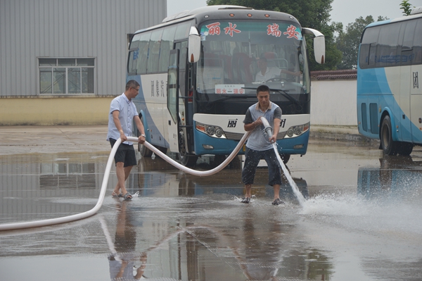 長(zhǎng)運(yùn)公司修理車間、調(diào)度室等昨天也受到了重創(chuàng)。一大早,修理工師傅們?cè)缫涯闷鹚畼?,打掃修理車間;員工們開始沖洗辦公場(chǎng)地。