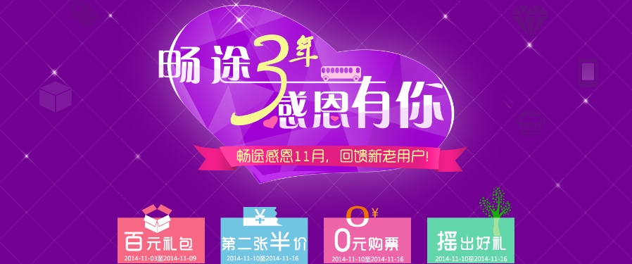 為了慶祝暢途網成立3周年,在11月份,暢途網推出了一整月的活動,有:11.3-11.9購票送百元禮包,11.10-11.16第二張票半價,11.17-11.23 0元購票,11.24-11.30搖錢樹送好禮。活動多多,優惠多多,讓大家在輕松享受購票的同時,帶給大家更多的實惠與樂趣!