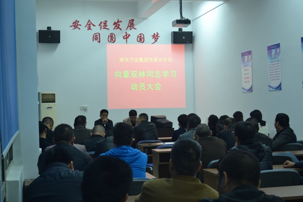詹慧文經理在會上作動員發言,號召全體員工向章雙林同志學習。他說,章雙林同志在乘客生命安全受到威脅的瞬間,能沉著冷靜的應對,并在確保其他旅客安全撤離的情況下,第一時間沖上去制服持刀旅客,真正體現了章雙林同志將旅客安全放在第一的責任意識,而且這種意識已經扎根在章雙林同志的心里。章雙林同志是繼吳斌之后涌現出的又一位麗水“最美司機”,我們要向身邊兩位“最美司機”學習,兢兢業業做好本職工作。希望快客公司全體駕駛員在確保安全第一的同時,認真做好優質服務工作;修理工做好車輛維修工作,將車輛故障降至最低;后勤做好為一線服務的工作。