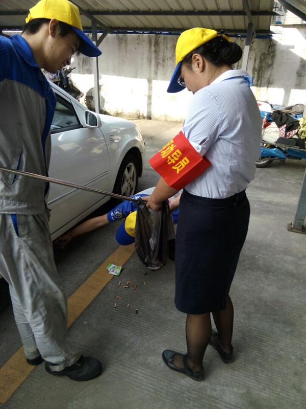 參加活動的小組成員們頭戴“麗汽”小黃帽,手拿撿煙頭的操作桿,在包干區內認真的巡視著,并對發現的垃圾及煙頭及時清理,細心的“小黃帽”周堯斌在一輛停置著的車輛下發現了許多煙頭,就馬上蹲下去,車底下的煙頭全撿了出來,在清理完后,大家臉上露出了開心的笑容。經過大家細心的保潔活動,我們包干區已經非常干凈,路面一個煙頭也不見了,包干區內的店家也自動的把門前放置的物品清理到店內,保證了人行道的暢通。
