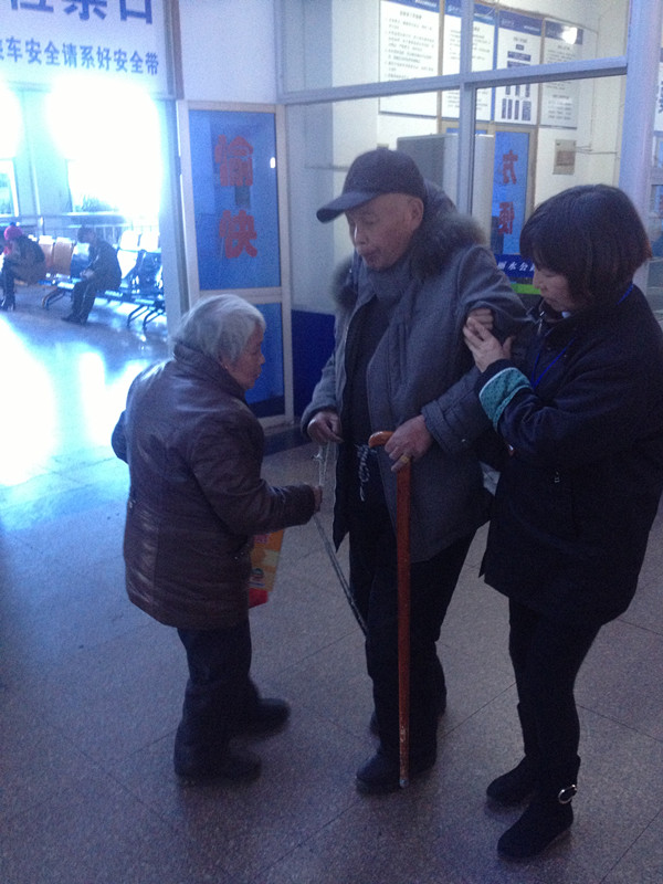 蔡美娟攙扶著老大爺,他老伴拉著繩子,走一步提一下大爺?shù)挠夷_緩慢的行走著。就這樣,蔡美娟扶著老大爺走幾步,就要稍停一下,等老大爺喘下氣再繼續(xù)走。由于13號檢票口位于東站候車廳的最里面,從售票廳走過去還是有100多米的樣子。一路上老大爺不停的問到了沒有,蔡美娟感覺到老大爺雖然有她扶著可還是有點(diǎn)吃不消了,就不斷的鼓勵老大爺:“再堅(jiān)持一下,我們就要到了!”就這樣,短短的100多米,他們?nèi)齻€人卻艱難的走了五六分鐘。(相關(guān)視頻已經(jīng)上傳在群空間)