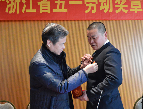 之后,市總工會黨組書記、常務副主席陳子民為章雙林頒發“浙江省五一勞動獎章”、證書和3000元獎金,并親自為章雙林佩戴了獎章。