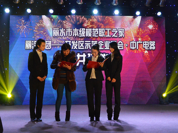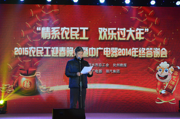 1月31日晚,由麗水市總工會和處州晚報主辦、中廣電器和麗汽集團承辦的“情系農民工歡樂過大年2015農民工迎春晚會暨中廣電器2014年終答謝晚會”在開發區中廣電器有限公司舉行,會上,麗汽集團和中廣電器還舉行了市本級模范職工之家結親共建儀式,兩家企業關愛職工、職工熱愛企業的典范決心通過“結對幫帶”,為市本級工會工作的發展增添更多的亮點和活力。