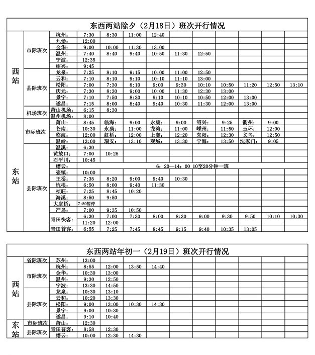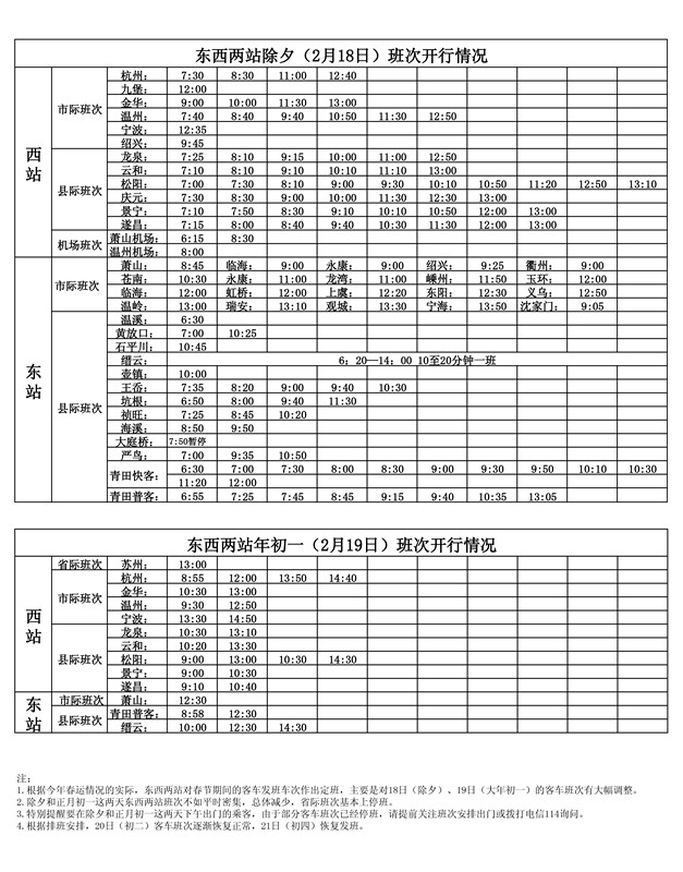 根據(jù)今年春運(yùn)實(shí)際的情況,東、西兩站對(duì)春節(jié)期間的客運(yùn)班車作出調(diào)整。2月18日(除夕)、19日(大年初一)的客運(yùn)班次變動(dòng)較大,密集減少,省際班次基本上停班。特別提醒要在除夕和正月初一這兩天下午出門的乘客,由于部分客車班次已經(jīng)停班,請?zhí)崆瓣P(guān)注班次安排,或撥打電信114詢問 ,盡量提前購票以免耽誤您的行程。從2月20日(初二)起客車班次逐漸恢復(fù),2月22日(初四)起全部恢復(fù)正常發(fā)班。