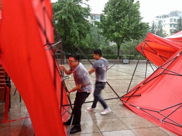 到傍晚16:50左右,正當我們順利支好遮陽棚,準備布置桌椅時,突然天空烏云密布,狂風(fēng)咋起,隨即暴雨便瘋狂的肆虐了我們。原本支好的遮陽棚瞬間東倒西歪,有些甚至直接散架。“這可不得了,要耽誤明天的活動”,劉良群副經(jīng)理立刻叫上大家沖出去“搶險”。雨水夾雜著汗水濕透了全身的衣服,他們沒有一句怨言。