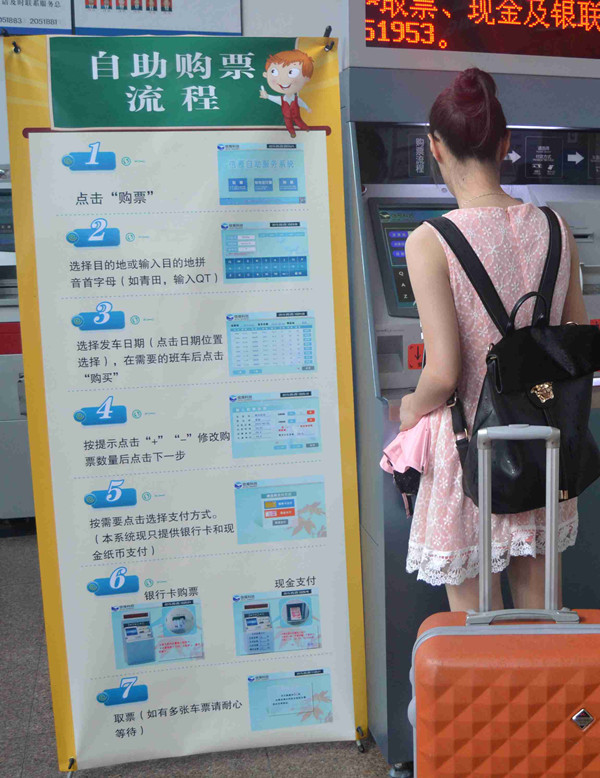 三是溫馨提示:在自助機的旁邊增設一塊醒目的自助購票流程圖,在自助售票機的各個關鍵部位還細心貼上了引人注目的提示語,為旅客自助購票提供細致溫馨的提示服務。