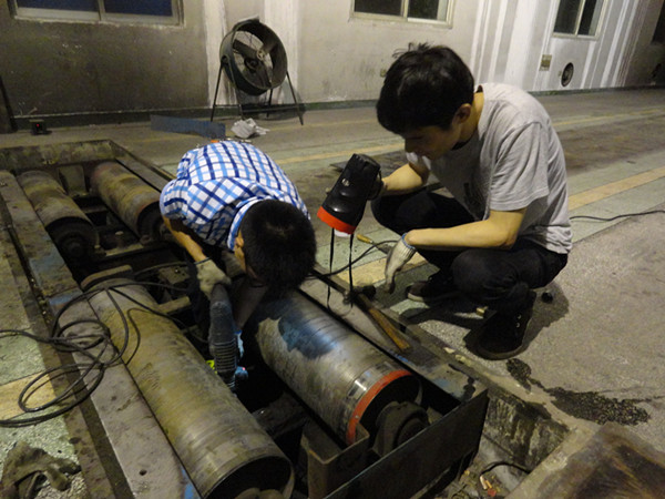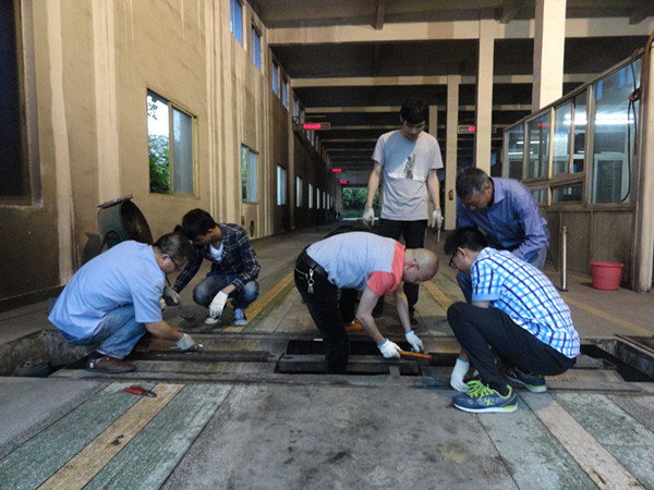 7月7日下午臨下班前,綜檢站1號檢測線的車速臺突然發生故障,舉升器無法正常升降。故障就是命令,為確保綜檢站高峰期檢測不受影響,檢測車間立即組織骨干人員對車速臺進行檢查,就連正在年休的車間主任金軍輝也聞訊趕回與部門員工一同作戰。經過一番拆卸檢查,故障點基本確定是油缸漏油和舉升橫梁斷裂。可是,要維修這兩個大部件,就需要拆掉整個工位機的核心部分,其工作量和工作難度之大,讓在場的搶修人員都不由的皺緊了眉頭。面對艱巨任務,車間副主任、高級技師金曉東發揮了黨員先鋒模范帶頭作用,迅速帶領青年員工對舉升橫梁進行焊接技術改造。車間員工們也齊心協力開始拆卸工位機,更換油缸油封、密封圈等。白天已超負荷工作的檢測車間員工,不知不覺又堅持了9個多小時,直至7月8日凌晨01點,最終圓滿完成了車速臺搶修任務,確保了綜檢站高峰期檢測不受影響。
